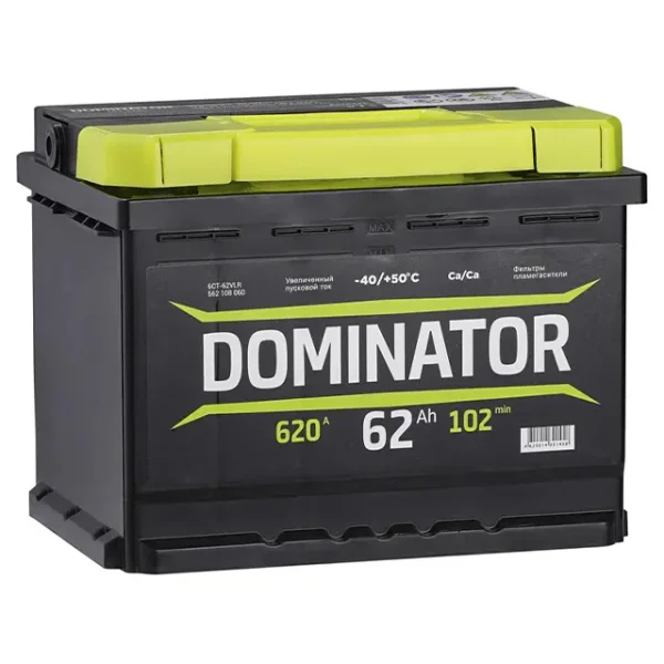 Представляем автомобильный Аккумулятор DOMINATOR 62Ah euro ССА620, страна производитель которого: Россия. Этот аккумулятор обладает ёмкостью 62 А/ч и пусковым током 620 А, что обеспечивает надежный запуск автомобиля.