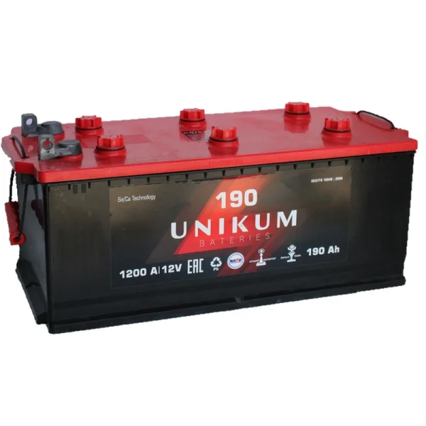 Представляем автомобильный Аккумулятор UNIKUM 190Ah прямой EN1200 рос. кр. плоская болт, страна производитель которого: Казахстан. Этот аккумулятор обладает ёмкостью 190 А/ч и пусковым током 1200 А, что обеспечивает надежный запуск автомобиля.